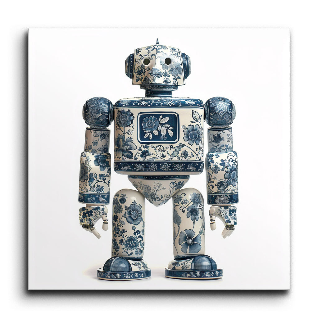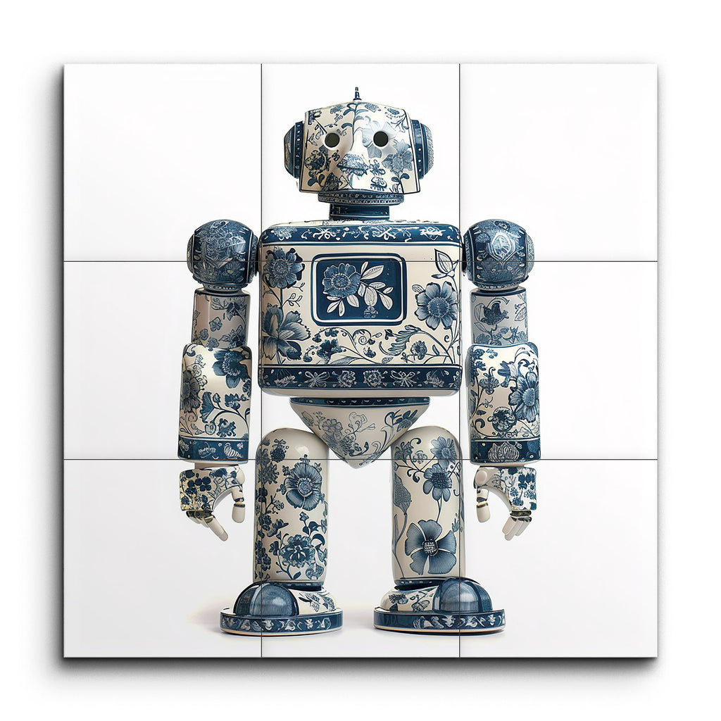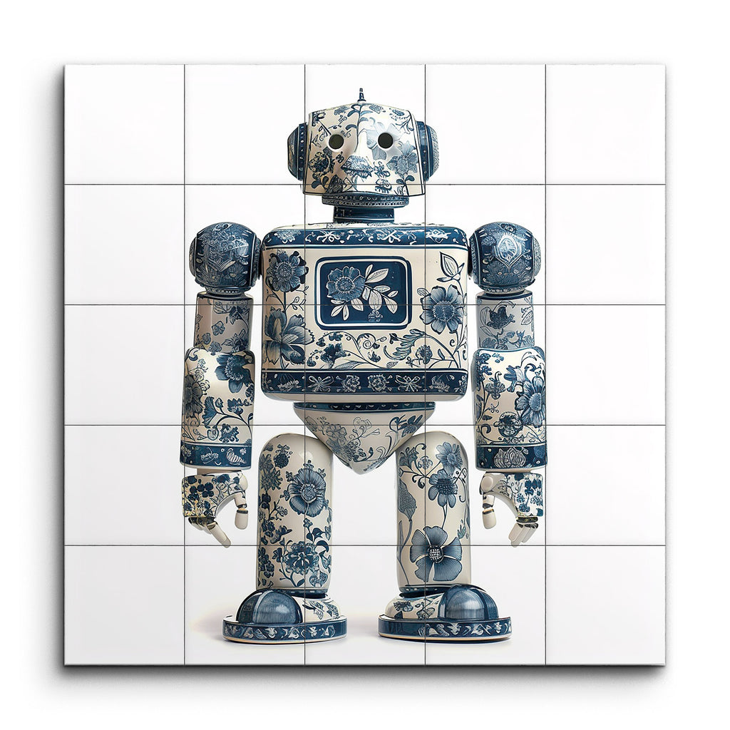 Experience the captivating fusion of tradition and technology with our exquisite tile mural. This remarkable artwork features a robot meticulously designed with intricate floral patterns inspired by classic blue and white porcelain. Each segment of the robot's form is adorned with detailed flowers and vines, creating a delicate yet striking visual. From its square head with circular eyes to its cylindrical limbs with spherical joints, every element is harmoniously decorated, offering a unique blend of old-world craftsmanship and modern innovation.