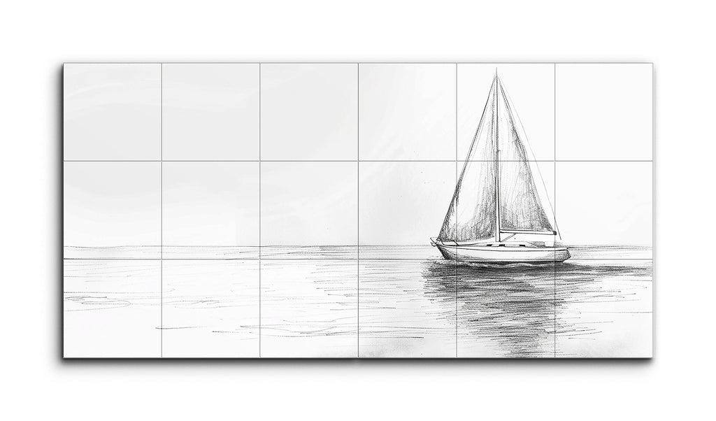 This tile mural showcases a black and white sketch of a sailboat gliding on calm waters, split across two panels for a striking diptych effect. The right panel prominently displays the sailboat with detailed lines capturing the texture of its sails and hull. The left panel extends the serene water, marked by gentle ripples, to a simple horizon. The artwork, reminiscent of pencil or pen sketches, uses varied line weights and shading to highlight depth and texture, evoking tranquility and isolation.