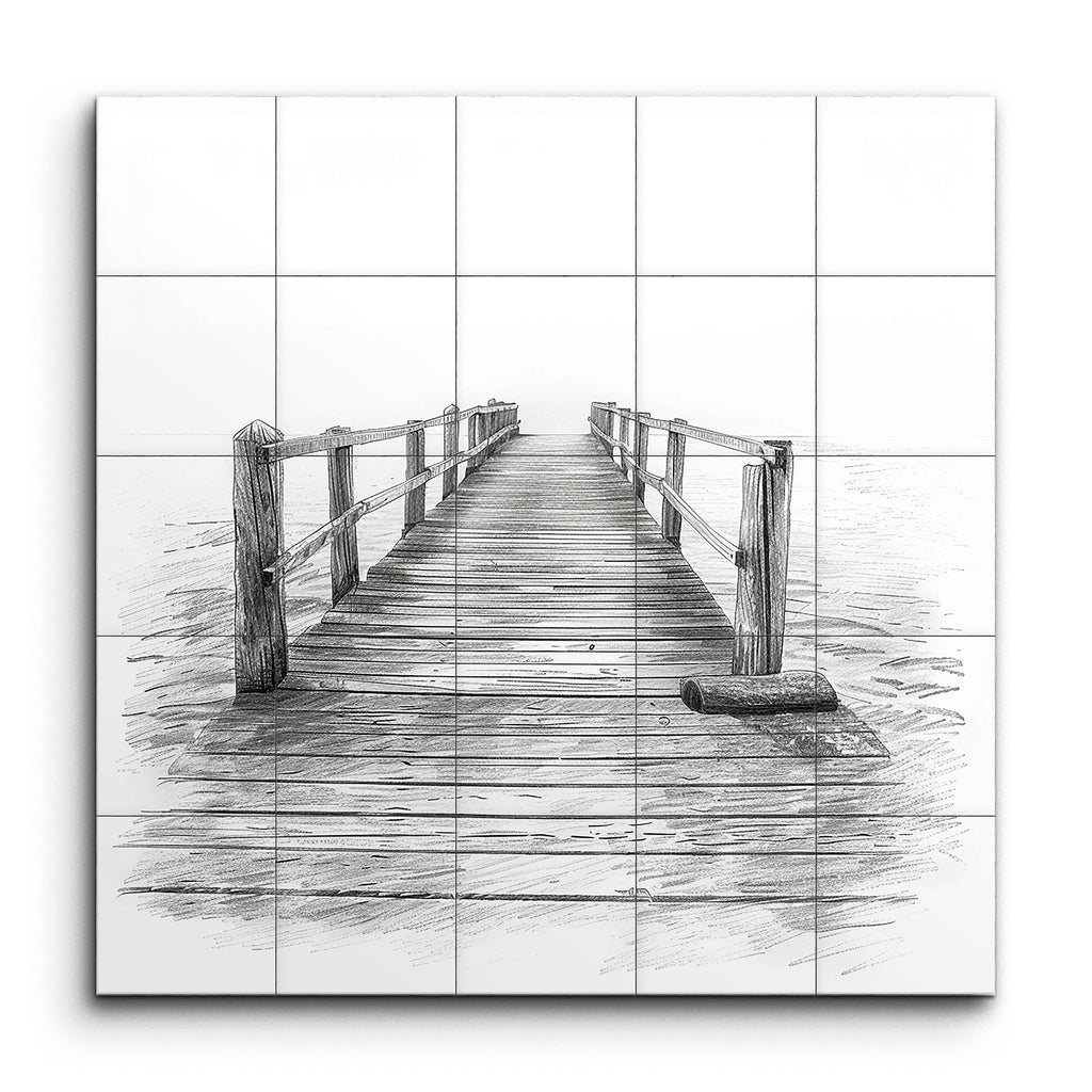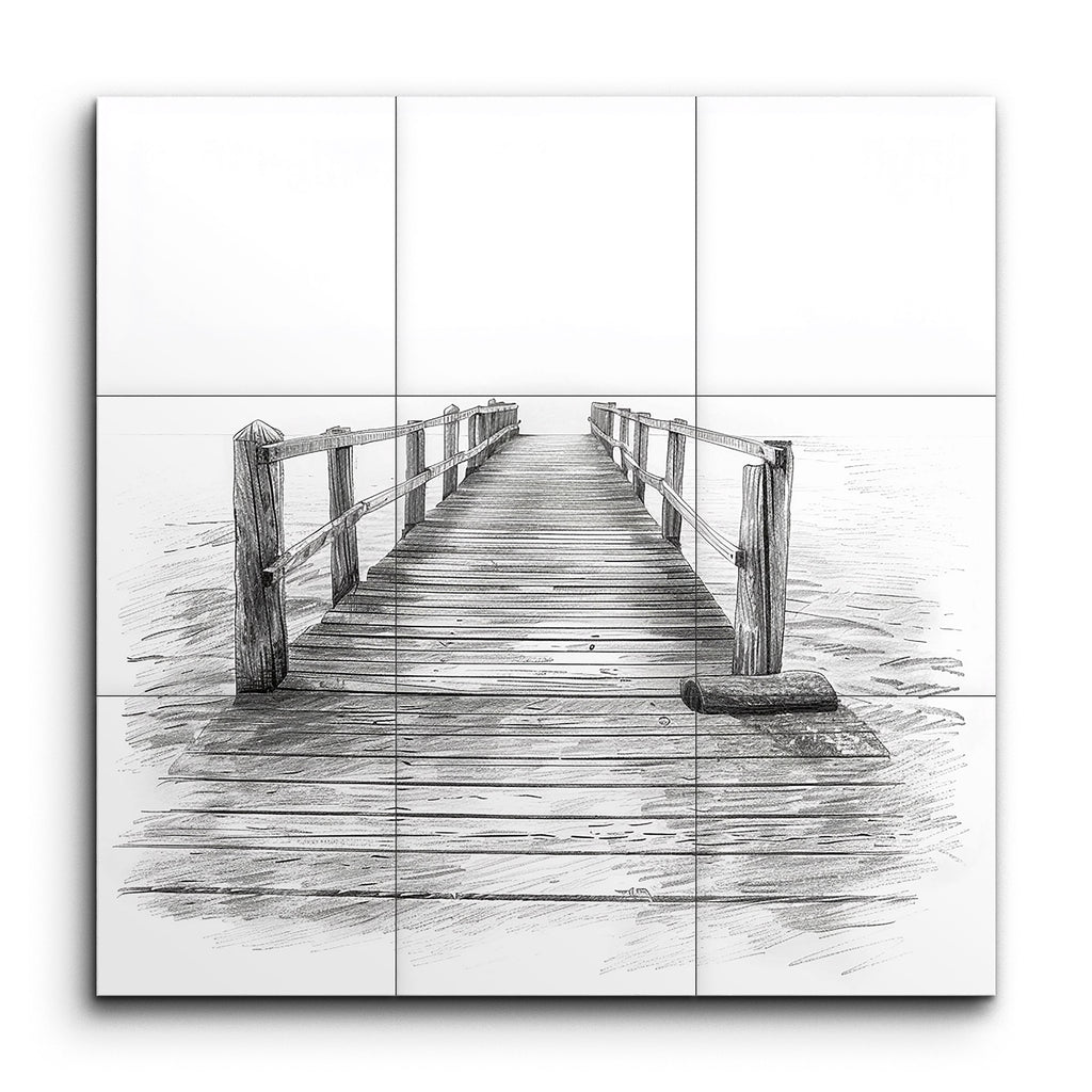 Transform your space with our captivating tile mural, featuring a meticulously detailed wooden pier extending into a serene body of water. The lifelike wood grain and textured railings draw the eye towards the horizon, creating a sense of depth and infinity. Rendered in a highly realistic style, this artwork's precise shading and line work evoke a tranquil, contemplative mood, perfect for fostering quiet reflection in any room.