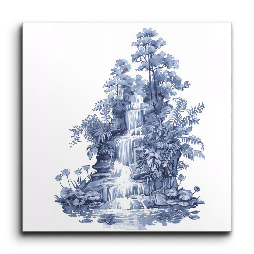 Transform your space with this exquisite tile mural, showcasing a serene natural scene in a traditional blue and white porcelain style. The artwork captures a cascading waterfall flowing through tiers of rocks into a tranquil pond adorned with water lilies and ripples. Surrounding this peaceful water feature is a lush, detailed array of vegetation, including tall trees with intricate foliage and layers of shrubs and ferns. The meticulous detailing and harmonious composition bring a timeless, elegant quality to any setting.