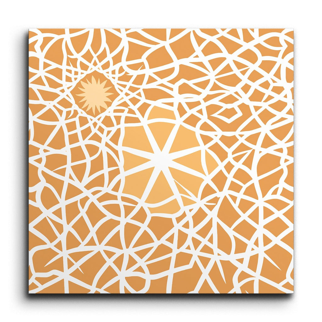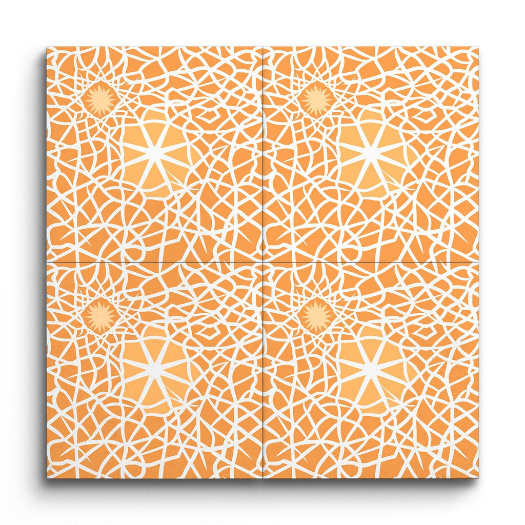 This decor tile showcases a captivating eclectic design, where intricate, interwoven white lines form a mesmerizing web-like structure on a warm, orange background. Starburst motifs punctuate the pattern, drawing the eye and adding a sense of dynamism to the design. The vibrant orange hue, contrasted with crisp white accents, creates a lively and energetic appearance. This tile seamlessly blends complexity with modern aesthetics, making it a versatile addition to any space looking for a touch of bold and artistic flair.