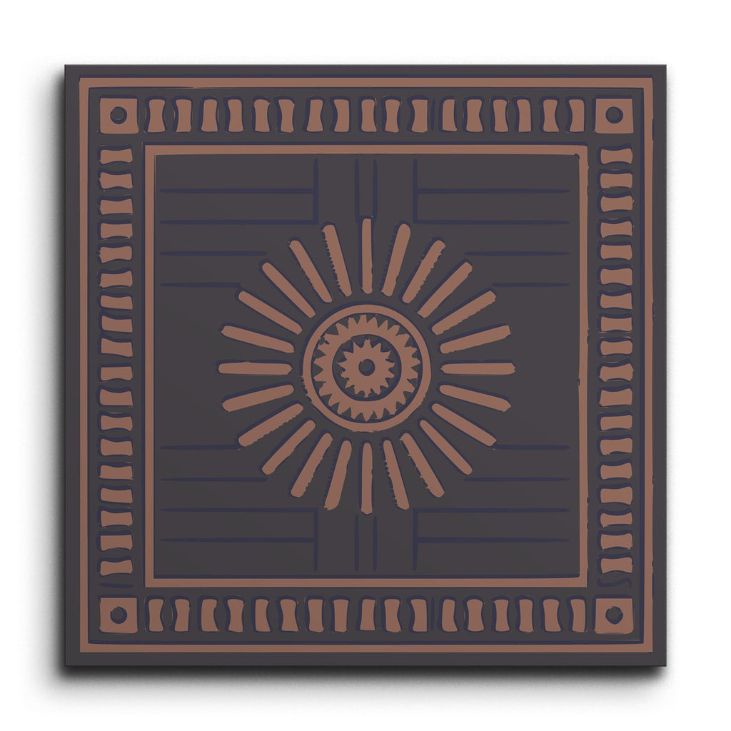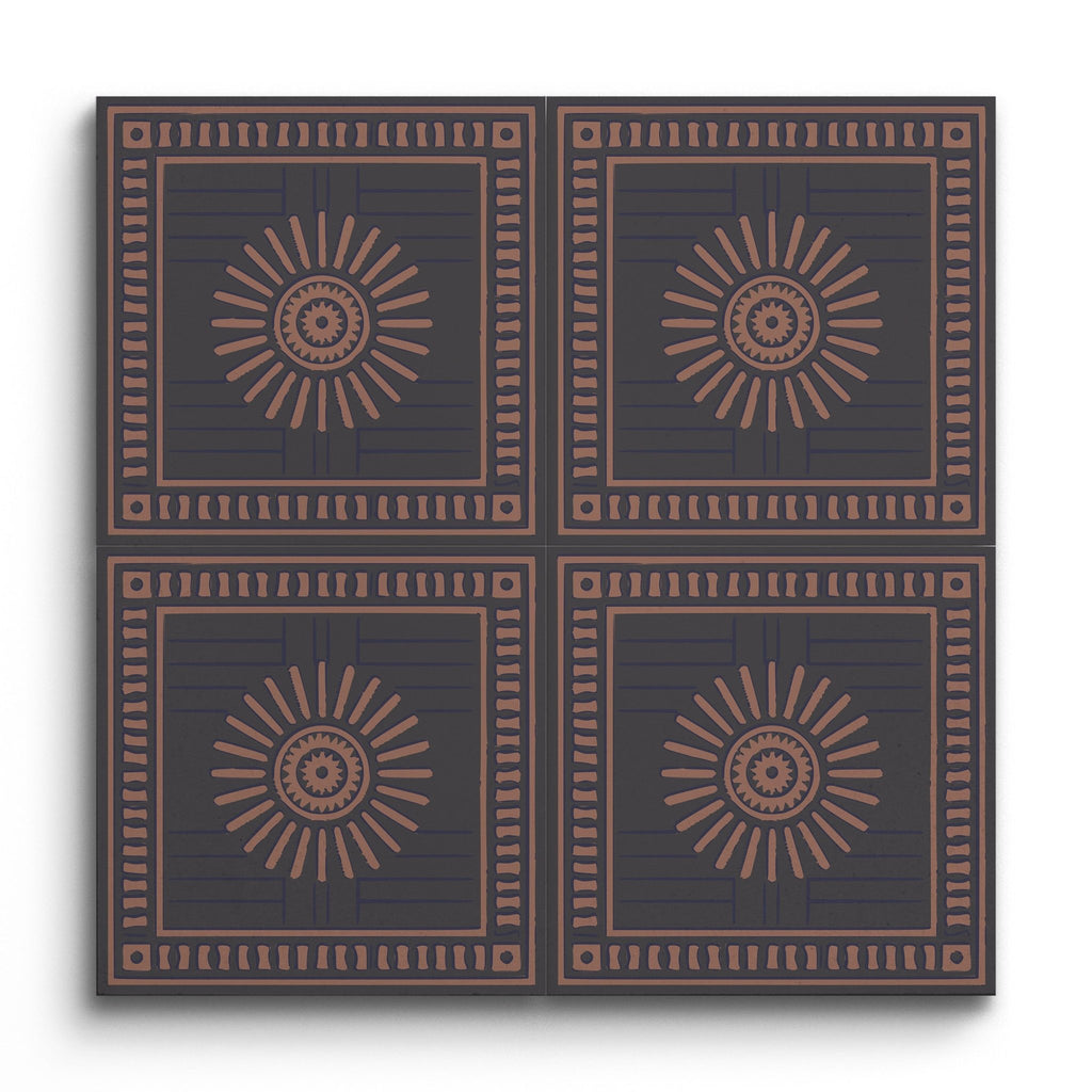 This decor tile showcases a central sunburst motif with elegant radiating lines, encircled by an array of geometric shapes and borders. Its symmetrical design reflects the classic charm of traditional encaustic patterns. The muted earth tones of dark gray and terracotta lend a sense of timeless sophistication, while the intricate detailing adds depth and character to any setting.