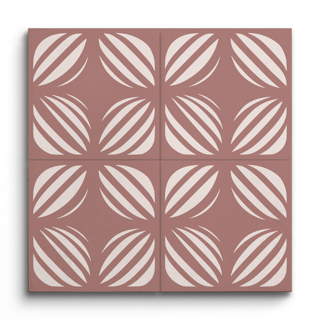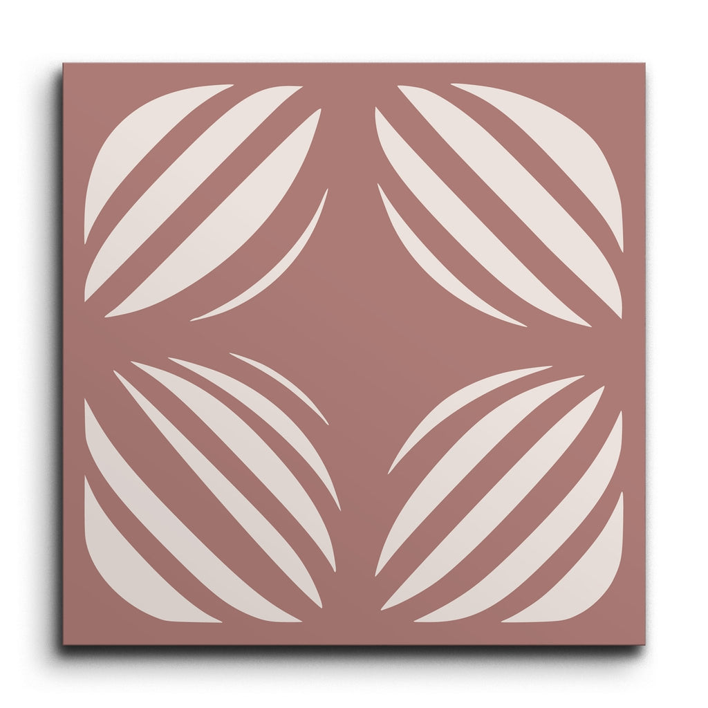This decor tile showcases a geometric design with a contemporary flair, featuring stylized leaf or petal shapes arranged in a harmonious grid. The muted terracotta background contrasts beautifully with the off-white shapes, offering a clean and modern aesthetic. The simplicity and repetition of the pattern create a minimalist yet captivating visual effect, making it a versatile choice for any space.