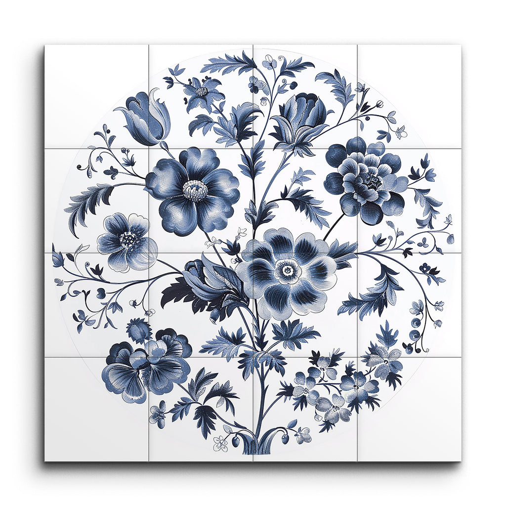 Bring the timeless elegance of traditional Delftware into your space with this exquisite tile mural. Rendered in soothing shades of blue, this detailed floral illustration captures the beauty of nature with intricately designed flowers, leaves, and stems. The circular composition features a harmonious blend of large multi-petaled blooms, delicate buds, and intertwining foliage, all meticulously shaded to create a lifelike, dynamic display. This artwork adds a touch of classic sophistication and serene beauty to any setting.